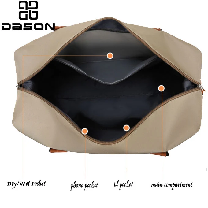మా డఫెల్ బ్యాగ్ లోపలి భాగంలో పొడి/తడి జేబు ఉంది, ఇది తడి బట్టలు లేదా టవల్ వంటి పొడి మరియు తడి వస్తువులను వేరు చేయడంలో మీకు సహాయపడుతుంది
