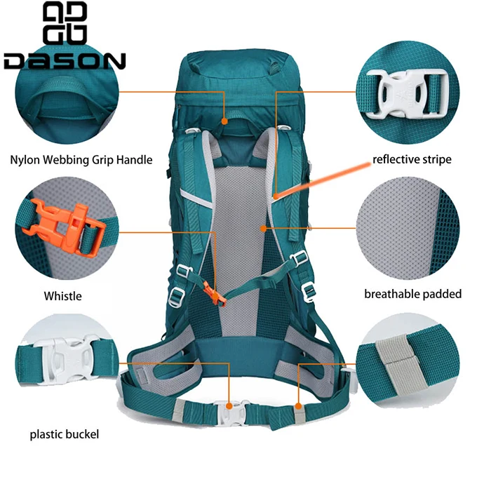 అవుట్డోర్ బ్యాక్ప్యాక్ రీన్ఫోర్స్డ్తో తయారు చేయబడింది అత్యవసర విజిల్ కట్టుతో సహా కుట్లు; చిన్న వస్తువులను వేలాడదీయడానికి డి-రింగ్
