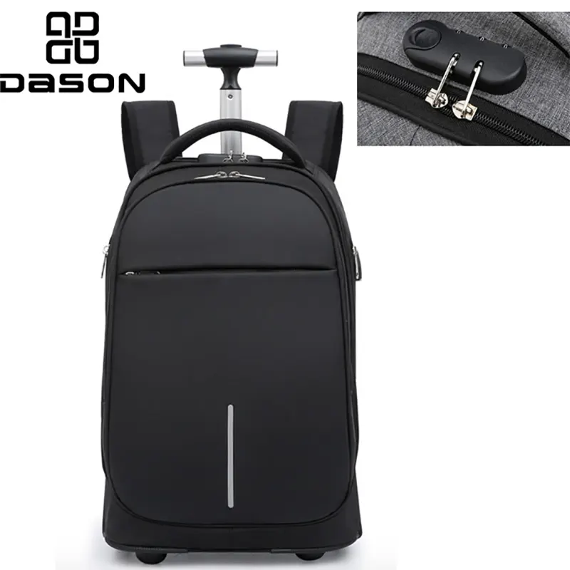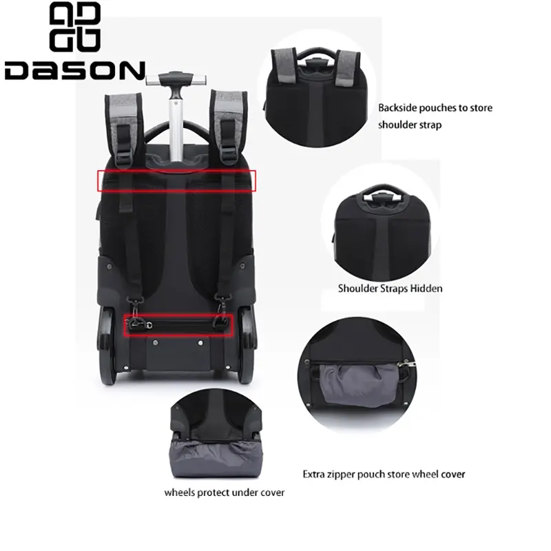 లాక్ చేయగల మెటల్ జిప్పర్స్ డిజైన్ దొంగల నుండి విలువైన వస్తువులను రక్షించడానికి వీల్స్ బ్యాక్ప్యాక్ను లాక్ చేయడానికి మీకు అందిస్తుంది