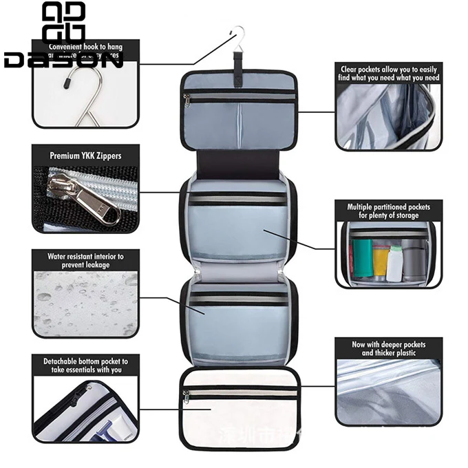 తో స్టైలిష్ ట్రావెల్ కాస్మెటిక్ ఆర్గనైజర్ గొప్ప సంస్థ కోసం మెటల్ ఉరి హుక్ మరియు బహుళ పాకెట్స్